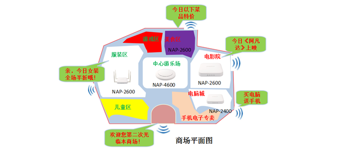 例如:在商場中心游樂場部署AP,提供最新的802.11ac的大帶寬接入,讓顧客在盡情游玩時,實(shí)時上網(wǎng)分享自己的游玩快照。在服裝區(qū)部署AP雙頻接入,實(shí)現(xiàn)購物人潮的大量接入。在電影院部署AP,天線內(nèi)置,不影響電影院的美觀。