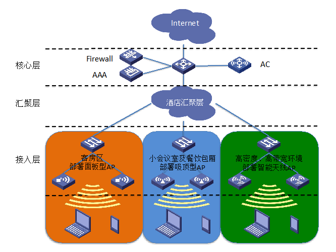 無線酒店解決方案的整個(gè)網(wǎng)絡(luò)架構(gòu)主要由四層結(jié)構(gòu)組成,分別是用戶終端層、無線接入層、匯聚層和核心層。